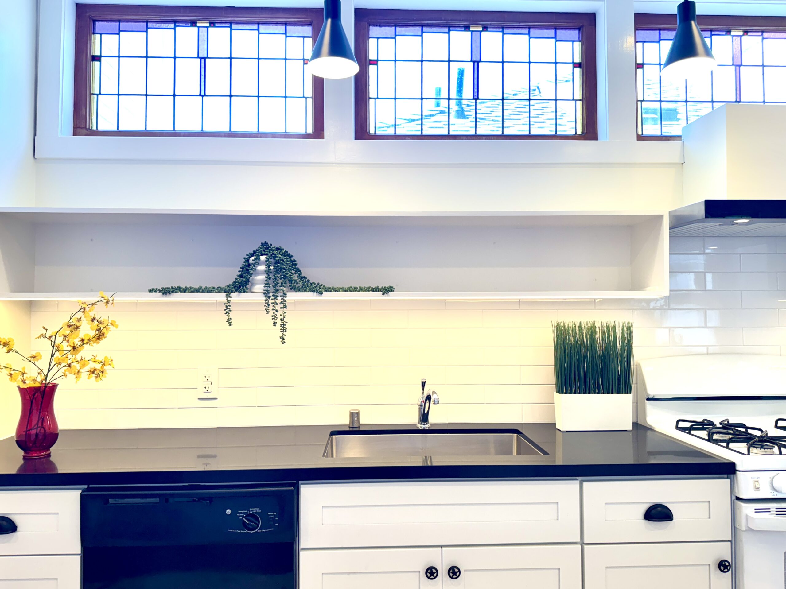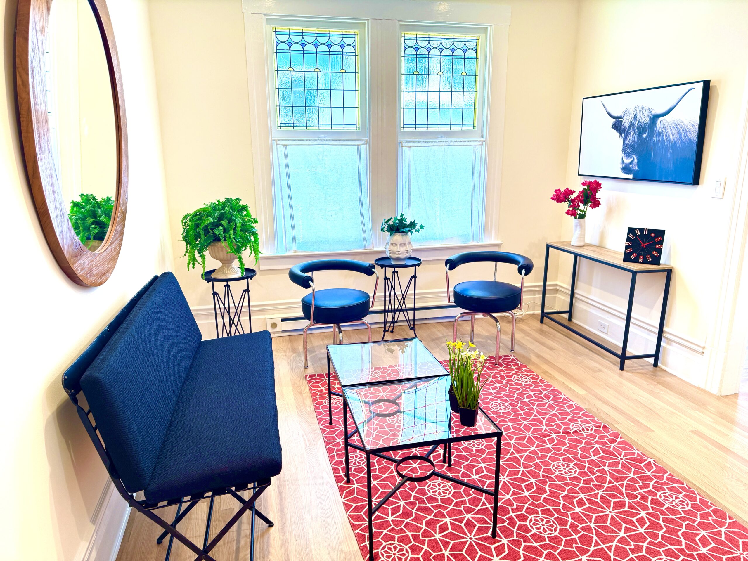 Part of the Victorian flavor derives from 5 vintage stained glass windows.