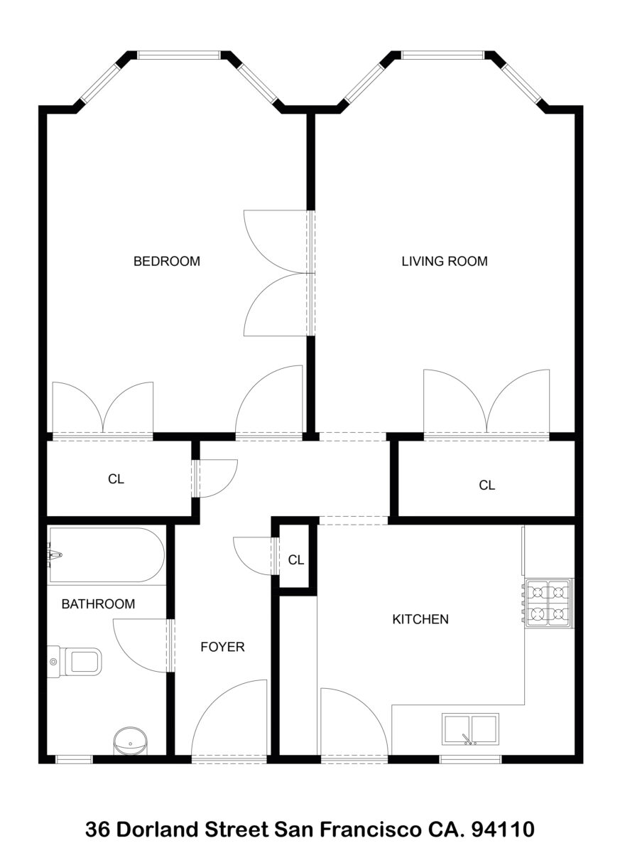 The bedroom and living room have bay windows, a series of six windows side-by-side.